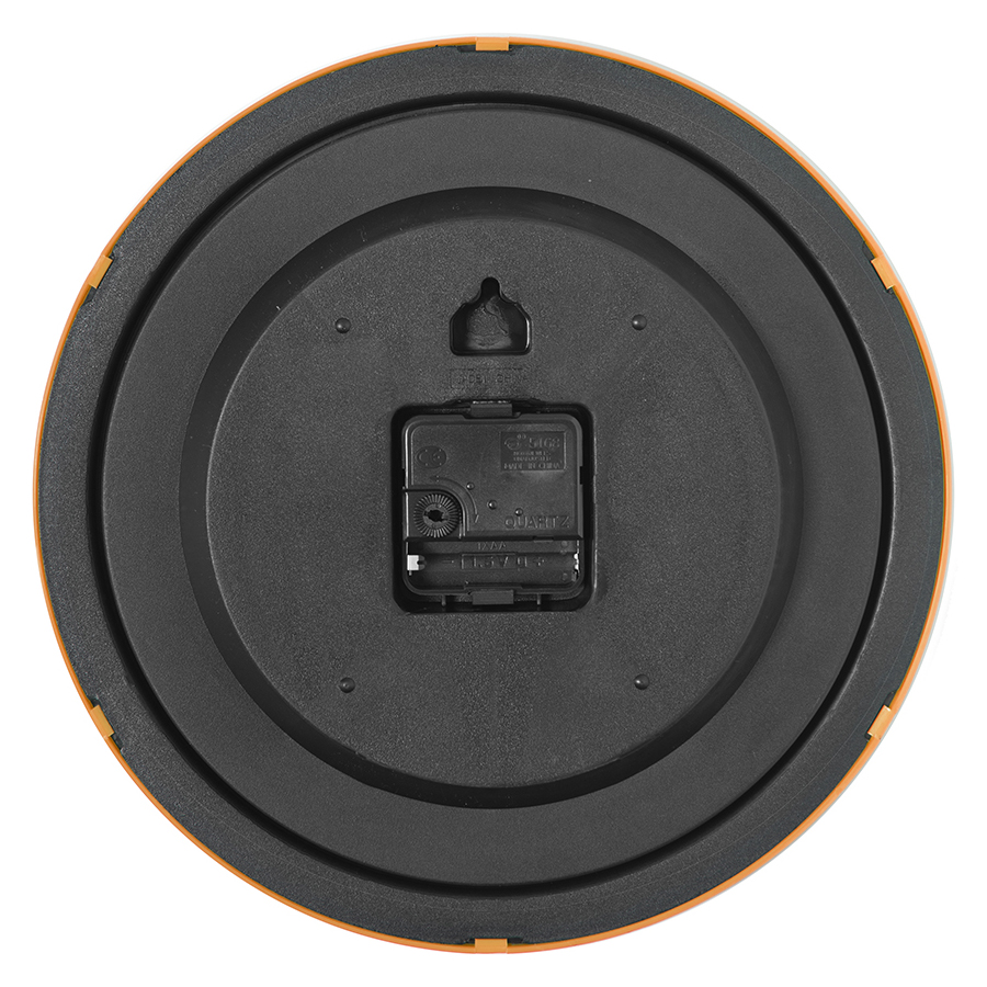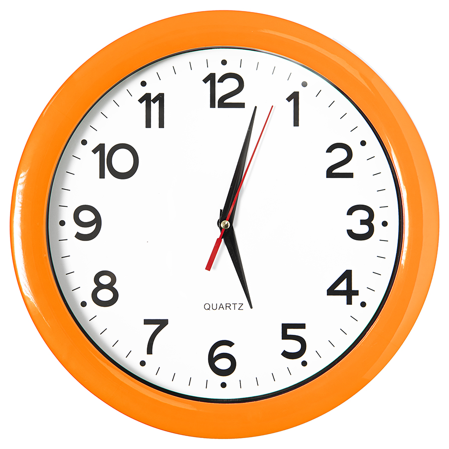 Pantone 151C Часы настенные с кварцевым механизмом, работают от 1 батарейки АА. Предназначены для вставки циферблата с печатью по индивидуальному дизайну Комплектация: 1) корпус с часовым механизмом, 2) минеральное стекло, 3) ободок, 4) стрелки - 3 шт. (часовая и минутная стрелки - черного цвета, секундная - красного цвета). Для удобства вставки циферблата с печатью по индивидуальному дизайну, стрелки часов не зафиксированы и поставляются в отдельном пакетике) 5) Муляж циферблата (диаметр 235 мм) Для вставки используется мелованная бумага матовая 300 гр.