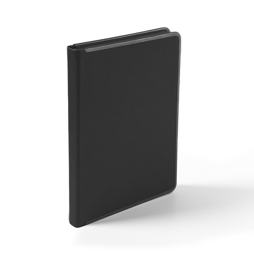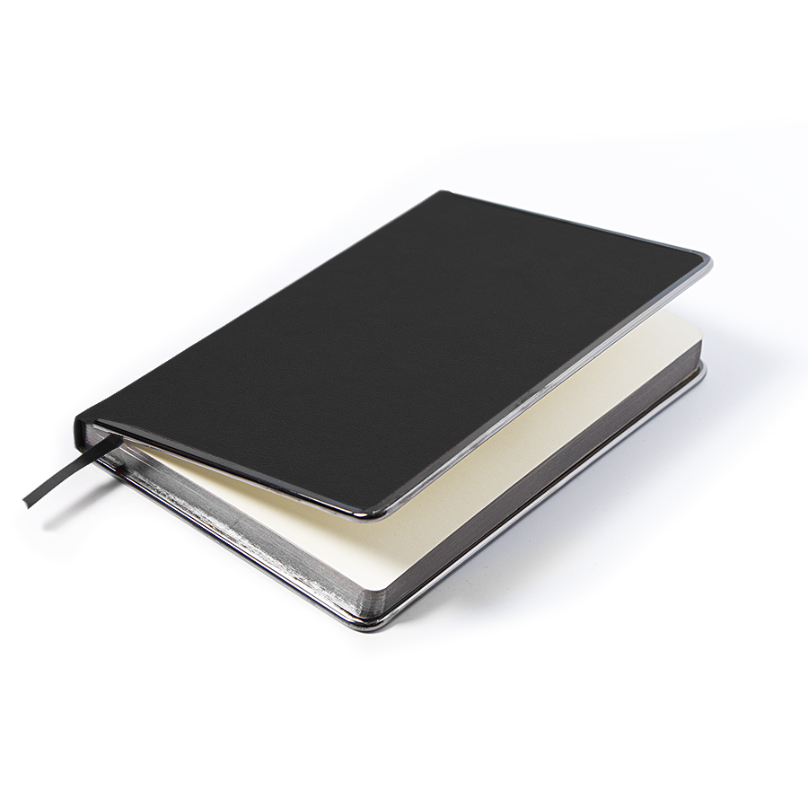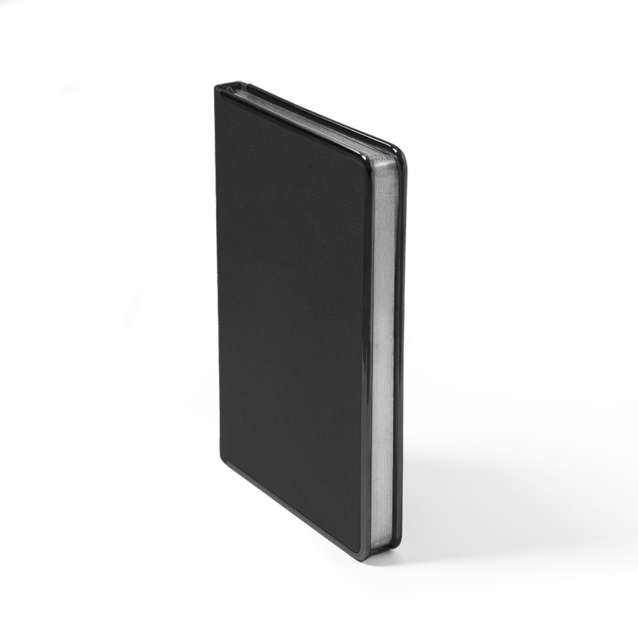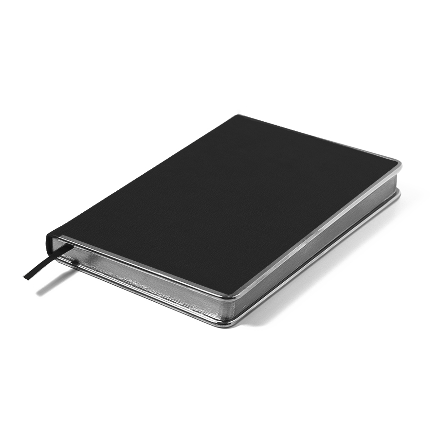 Цвет обложки, близкий к пантону Black C Размер 145*205 мм Переплет твердый Металлическая рамка по периметру, цвет gun metal Обложка термоактивный PU Блок недатированный, в линейку Скругленные углы, двухцветная печать Бумага кремовая, плотность 70 г м2 Форзац нахзац кремовые 272 страницы 14 инфостраниц Обрез в цвет металлической рамки Каптал и ляссе в цвет обложки Упаковка крафтовый сливбокс