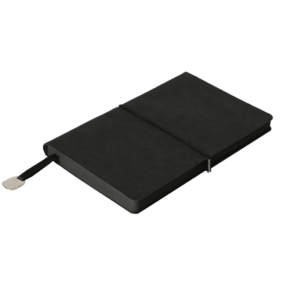 Цвет обложки, близкий к пантону Black C Размер 130*210 мм Переплет мягкий Обложка термоактивный PU Блок недатированный, в линейку Скругленные углы, двухкрасочная печать Бумага кремовая, плотность 70г м2 Форзац нахзац серые Обрез в цвет обложки Резинка горизонтальная, 2 мм Ляссе двойное, с глянцевым металлическим шильдом 272 страницы 14 инфостраницПерфорация на 8ми последних листах Упаковка крафтовый сливбокс