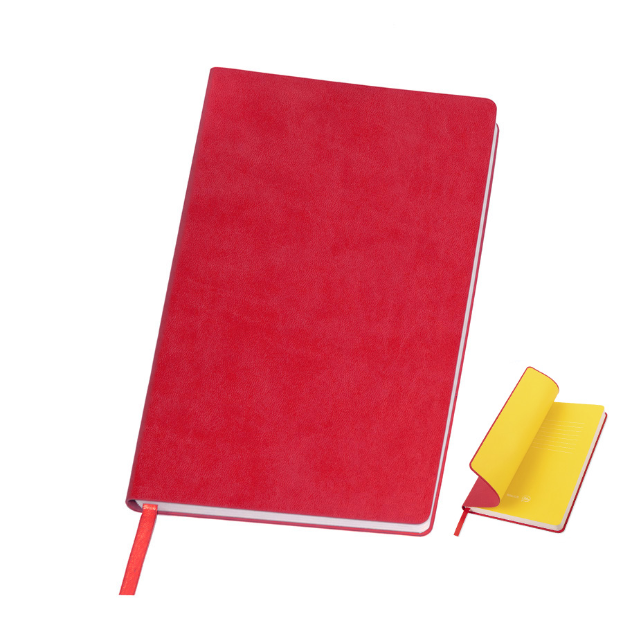 Блокнот с мягкой термоактивной обложкой и популярной комбинацией цветов Термоактивный PU материал Velvet Цвет обложки, близкий к Pantone 200С Цвет форзаца, близкий к Pantone Yellow U Внутренний блок 256 страниц в линейку Идеально скругленные углы блока Перфорированные 8 последних листов Кремовая FSC бумага 70 г м2 Ляссе в тон обложки