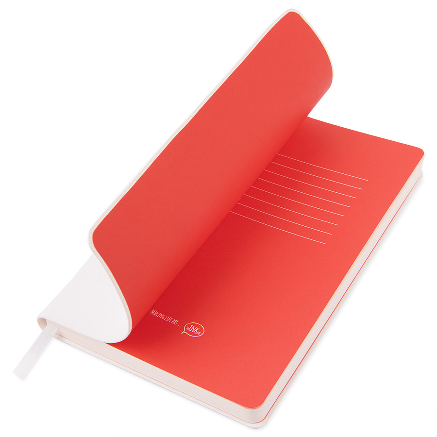 Блокнот с мягкой термоактивной обложкой и популярной комбинацией цветовТермоактивный PU материал VelvetЦвет обложки белыйЦвет форзаца, близкий к Pantone Red 2035UВнутренний блок 256 страниц в точкуИдеально скругленные углы блокаПерфорированные 8 последних листов Кремовая FSC бумага 70 г м2Ляссе в тон обложкиИндивидуальная упаковка: фирменный сливбокс thINKme