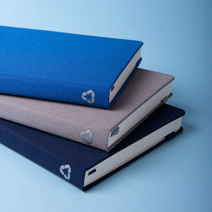 100% эко-блокнот Размер: 130х210 мм Переплет: твердый Обложка: RPET рециклированный полиэстер, полученный из переработанных пластиковых бутылок Материал сертифицирован в Нидерландах по Global Ecological Standard Отделка: жаккардовая резинка 12 мм и пенхолдер в тон обложки Форзац нахзац: кремовый Блок: недатированный Разлиновка: в линейку Количество страниц: 256 Углы блока: скругленные Цвет бумаги: кремовый Плотность бумаги: 70г м2 Ляссе: в тон обложке Карман для визиток: есть Упаковка: фирменный сливбокс thINKme