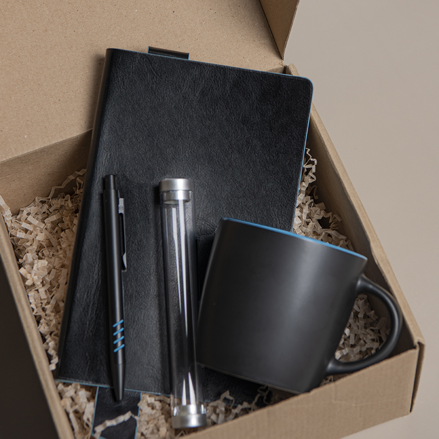 Набор подарочный В набор входят: Кружка INTRO, черный с голубымарт. 26701 22размер: D=9 см, Н=8.6 смобъем: 350 млматериал: керамикаРучка шариковая TATTOO, черный с голубыми вставками grip, арт. 40308 22размер: 1 x 14 смматериал: металлФутляр-тубус для одной ручки, прозрачный серыйарт. 19606 90размер: 15 х 2 смматериал: пластикБизнес-блокнот "Trendi", черно-голубой, мягкая обложка, в линейкуарт. 21229 35 22Размер блокнота 130*210 мм.Имитирующая натуральную кожу мягкая PU обложка Bondy черного цвета по краям имеет яркую цветовую отделку.Широкая закладка из аналогичного PU также контрастно окрашена по краям.Форзац и нахзац в тон цветному канту обложки.Цвет форзаца нахзаца и отделки обложки близок к pantone 2201CВнутренний блок 256 страниц в линейку.Идеально скругленные углы блока.Перфорированные 8 последних листов.Кремовая eco-friendly FSC бумага 70 г м2.Карман для записок в тон нахзаца.Стружка бумажная, бежевая 3 мм, арт. 20413 204вес: 50 гр.Коробка подарочная BOX, самосборнаяарт. 21024внутренний: 24*21*11 см, внешний: 25,5*21,5*11 см.материал: картон МГК бурыйВНИМАНИЕ! Набор поставляется в разобранном виде.