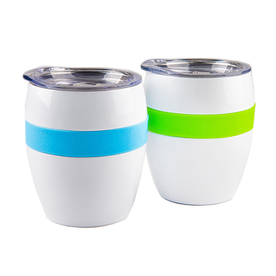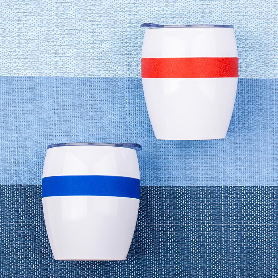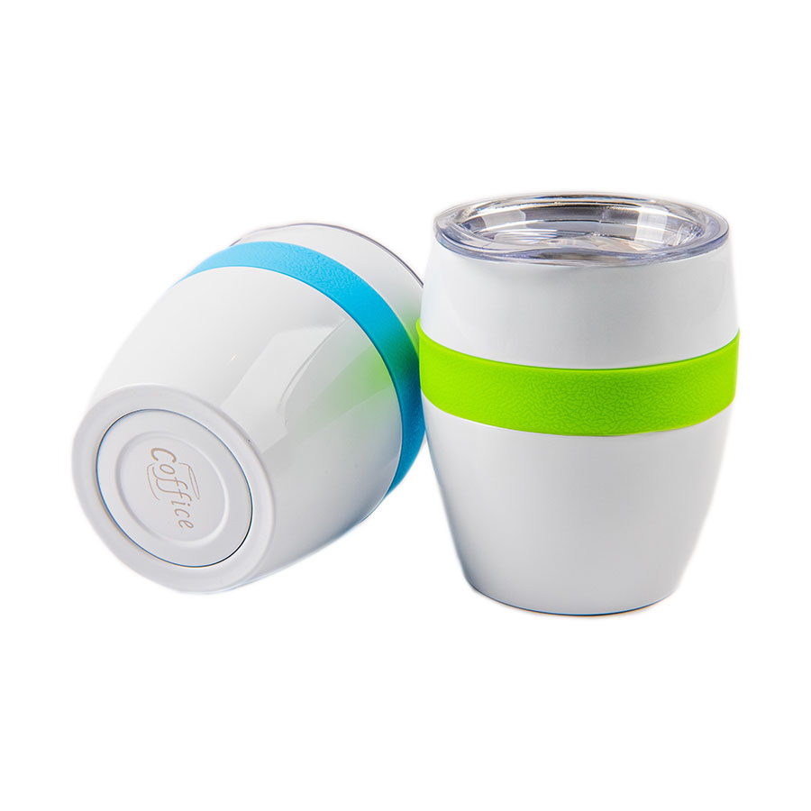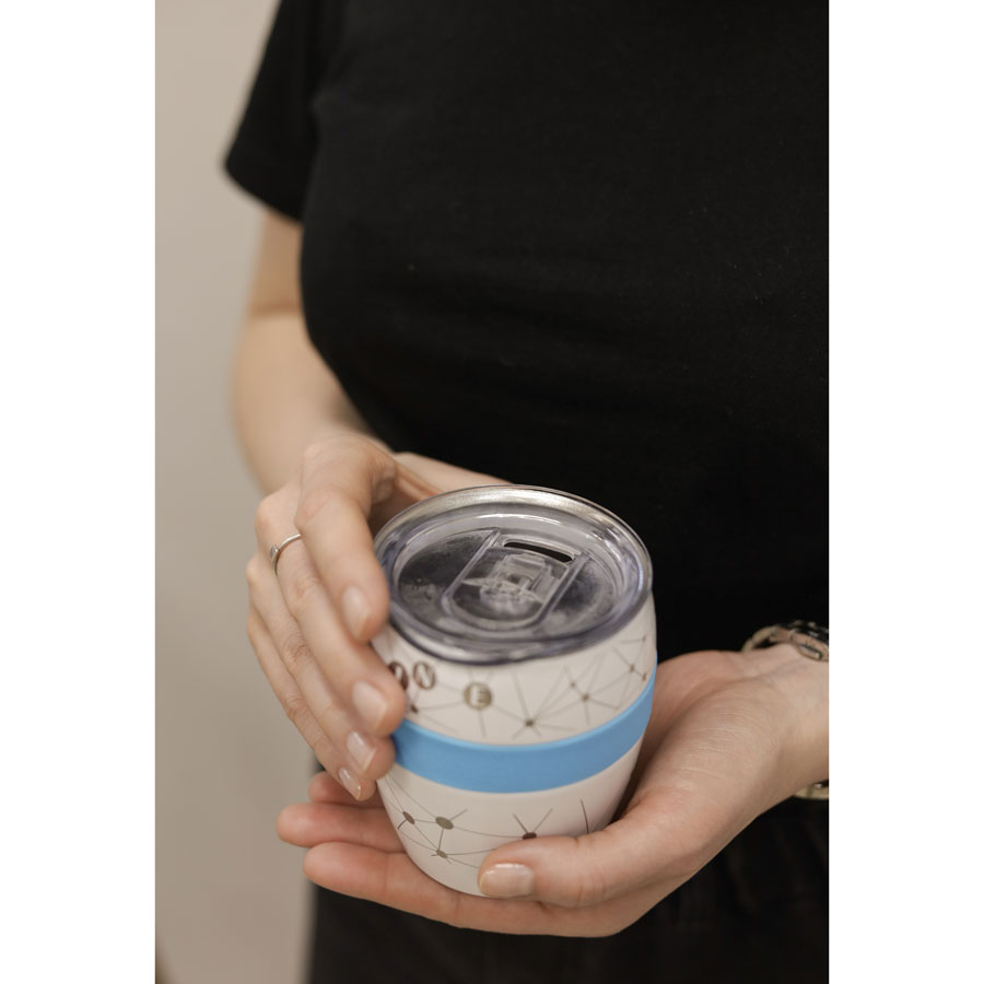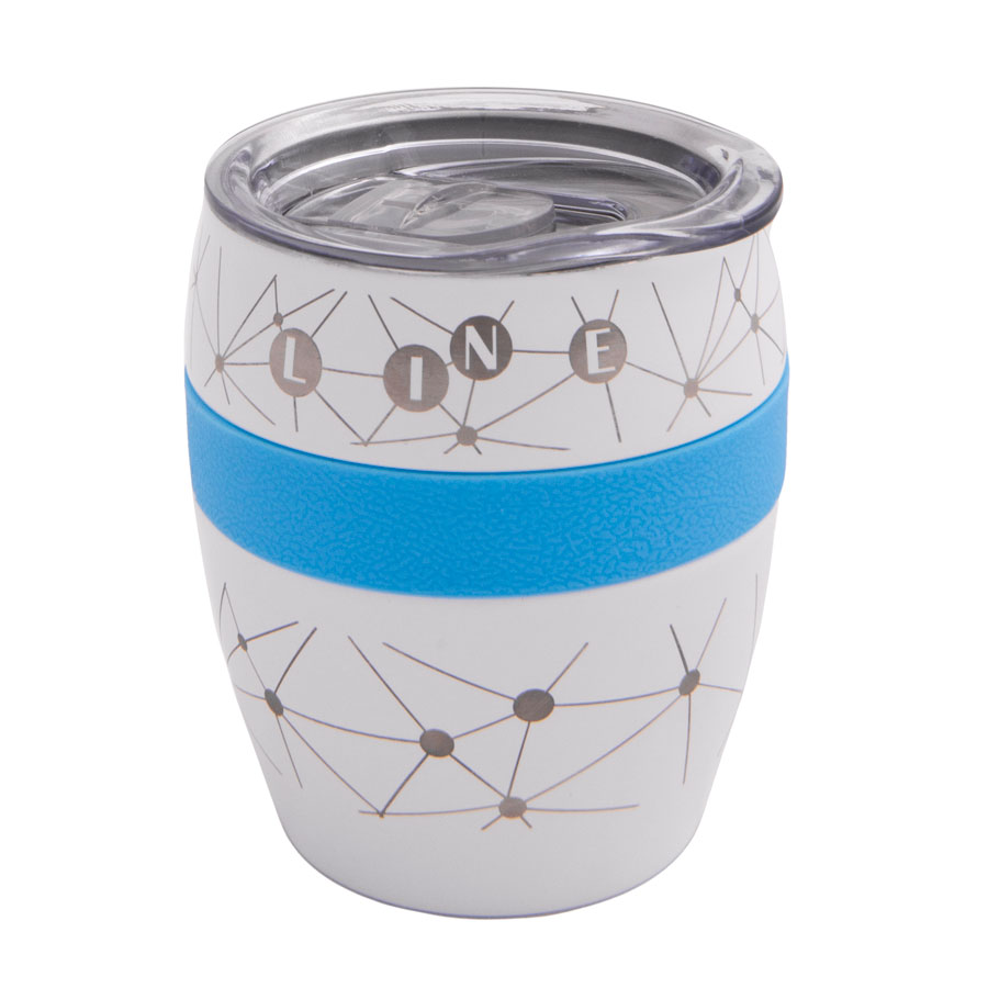 Термокружка LINE с двойными стальными стенками сохранит напиток горячим до 3х часов, холодным - до 4х часов.Благодаря форме удачно лежит в руке, и за счет резинового браслета не скользит. Высота без крышки 9,7 см, подходит для большинства кофемашин.