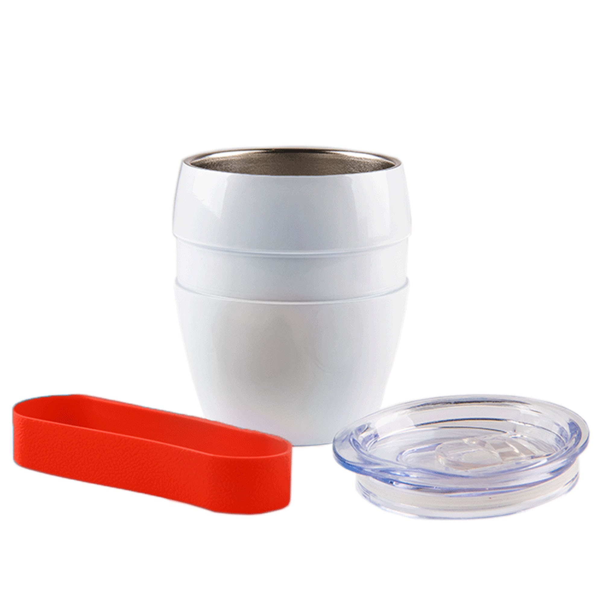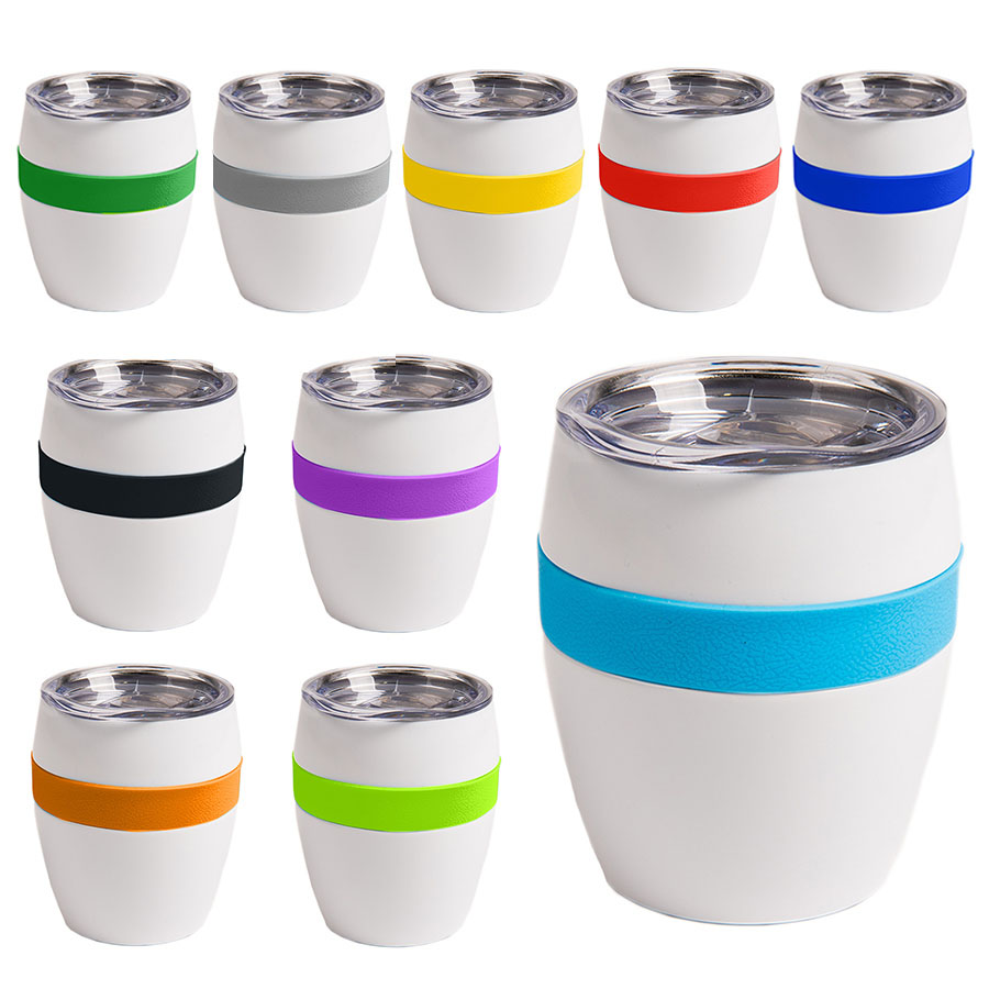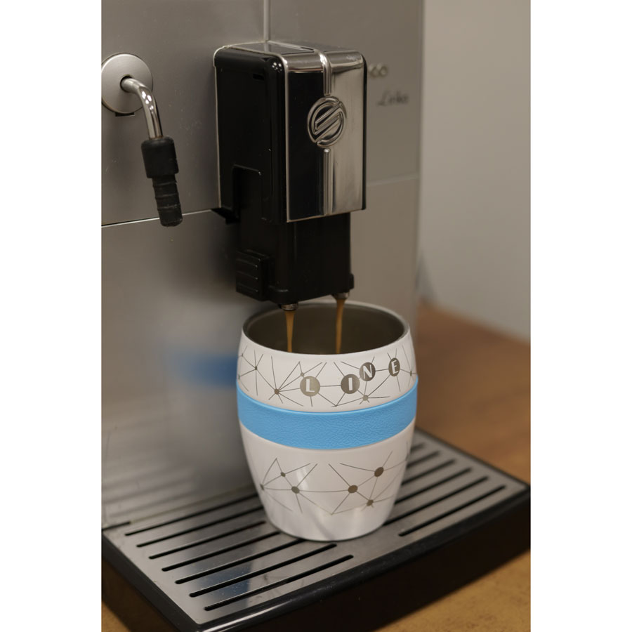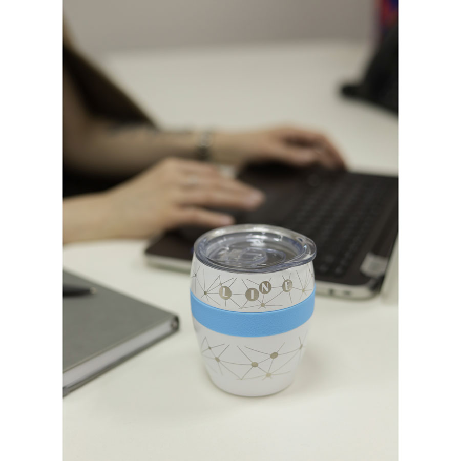 Термокружка LINE с двойными стальными стенками сохранит напиток горячим до 3х часов, холодным - до 4х часов.Благодаря форме удачно лежит в руке, и за счет резинового браслета не скользит. Высота без крышки 9,7 см, подходит для большинства кофемашин.