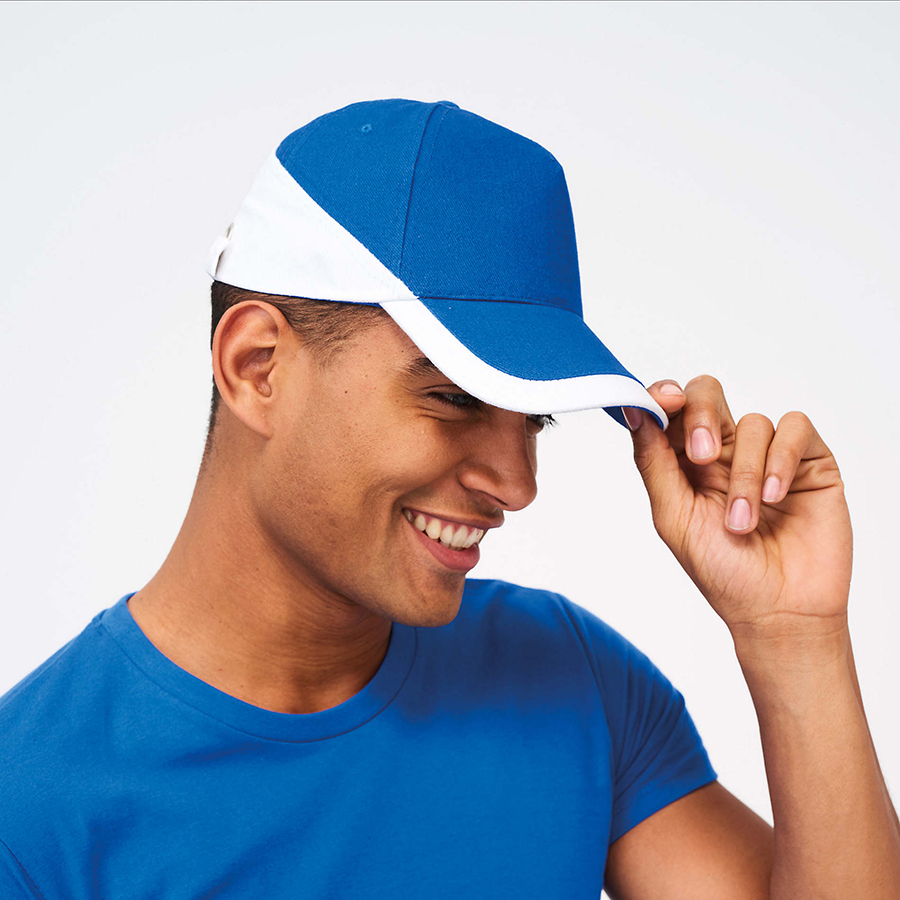 Двухцветная бейсболка BOOSTER без лобового шва с жестким козырьком "сэндвич". 4 обшивных люверса, регулируемая металлическая застежка. Цвет (тёмно-синий) близкий к PANTONE 539C
