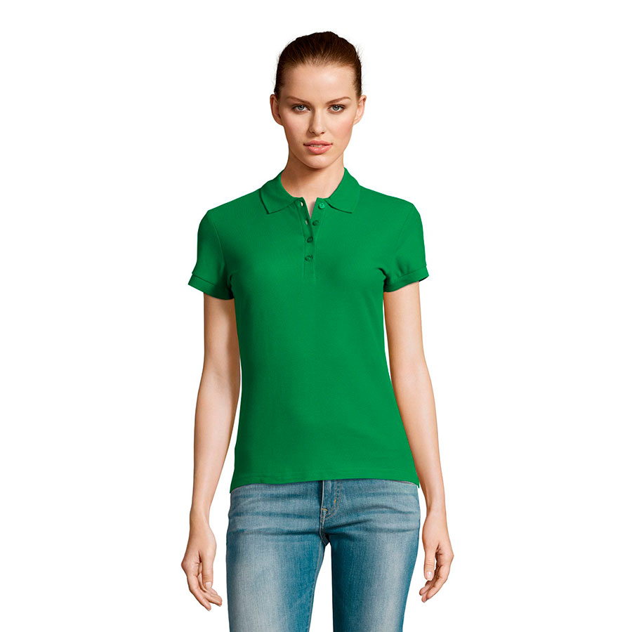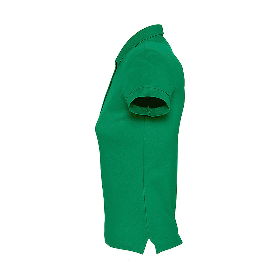 Приталенное женское поло.Прямой низ, боковые разрезы. Рукав короткий.Воротник и манжеты из эластичной резинки-рибаны.Ворот укреплен тесьмой.4 пуговицы в тон изделия на планке.Запасная пуговица на внутреннем боковом шве.Цвет близкий к PANTONE 348C