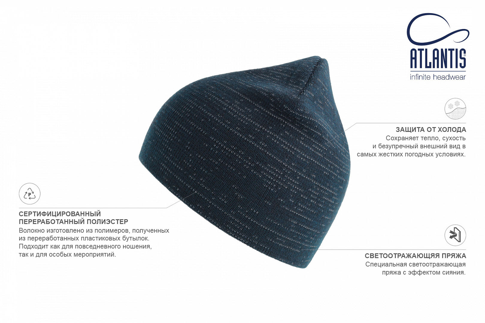 Шапка вязаная "SHINE" светоотражающая, темно-синий, 50% переработанный полиэстер, 50% акрил