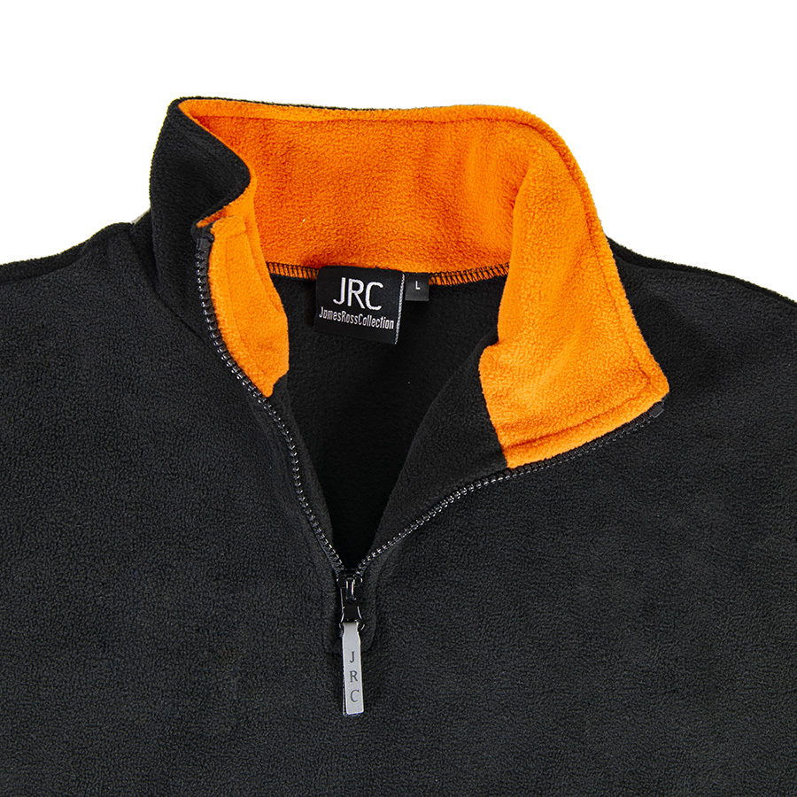 Основная ткань: цвет, близкий к Pantone Black C, воротник: цвет, близкий к Pantone 1585 C Утепленная толстовка повышенной плотности. Удобный воротник-стойка на молнии. Светоотражающий съемный пуллер с символикой JRC. Два кармана на молнии. Утягивающий шнурок по низу изделия. Эластичные резинки по низу рукавов.