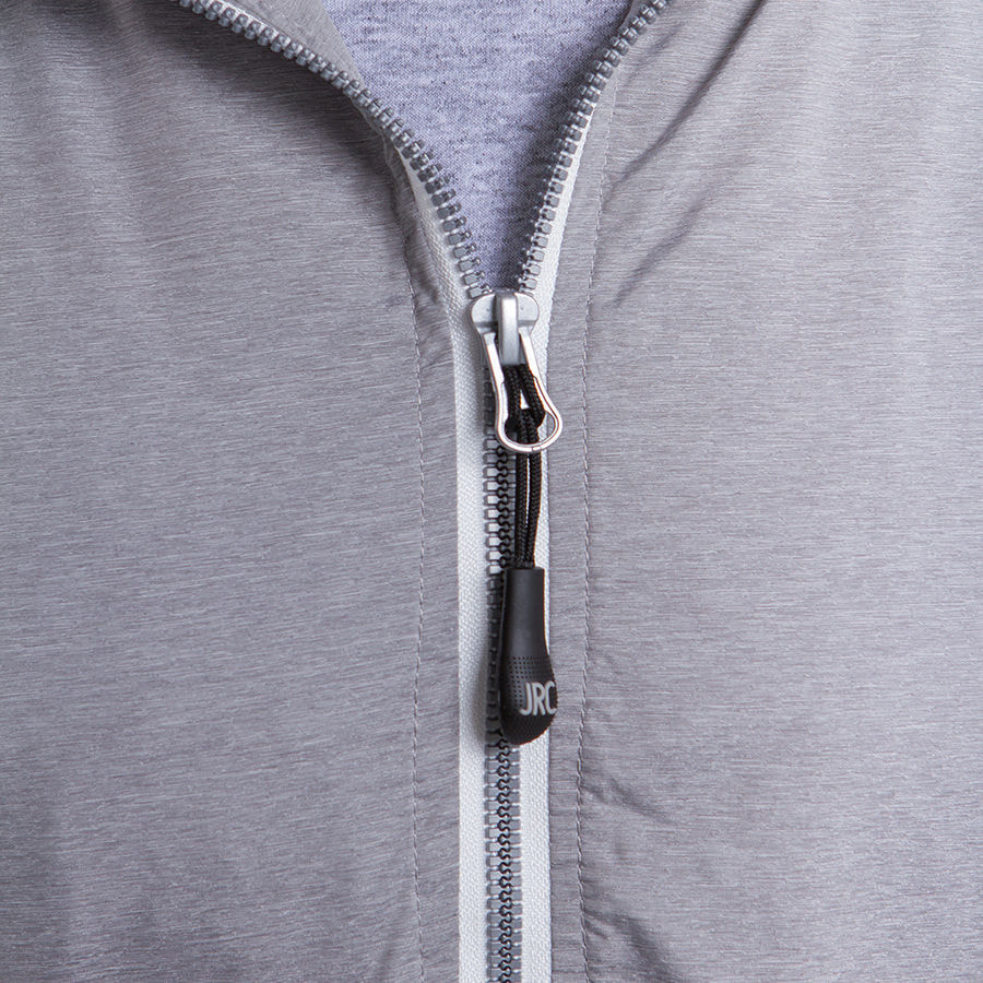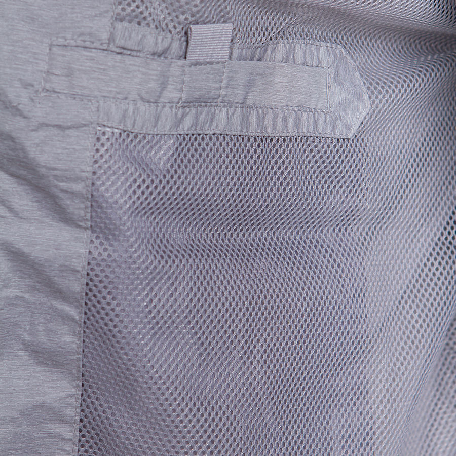 Ветровка водонепроницаемая из нейлона с «сеточкой». Два контрастных кармана на молнии и внутренний карман. Сетчатая подкладка с застежкой-молнией для легкой вышивки. Эластичная резинка по низу изделия и манжетах и регулируемые шнурки на капюшоне