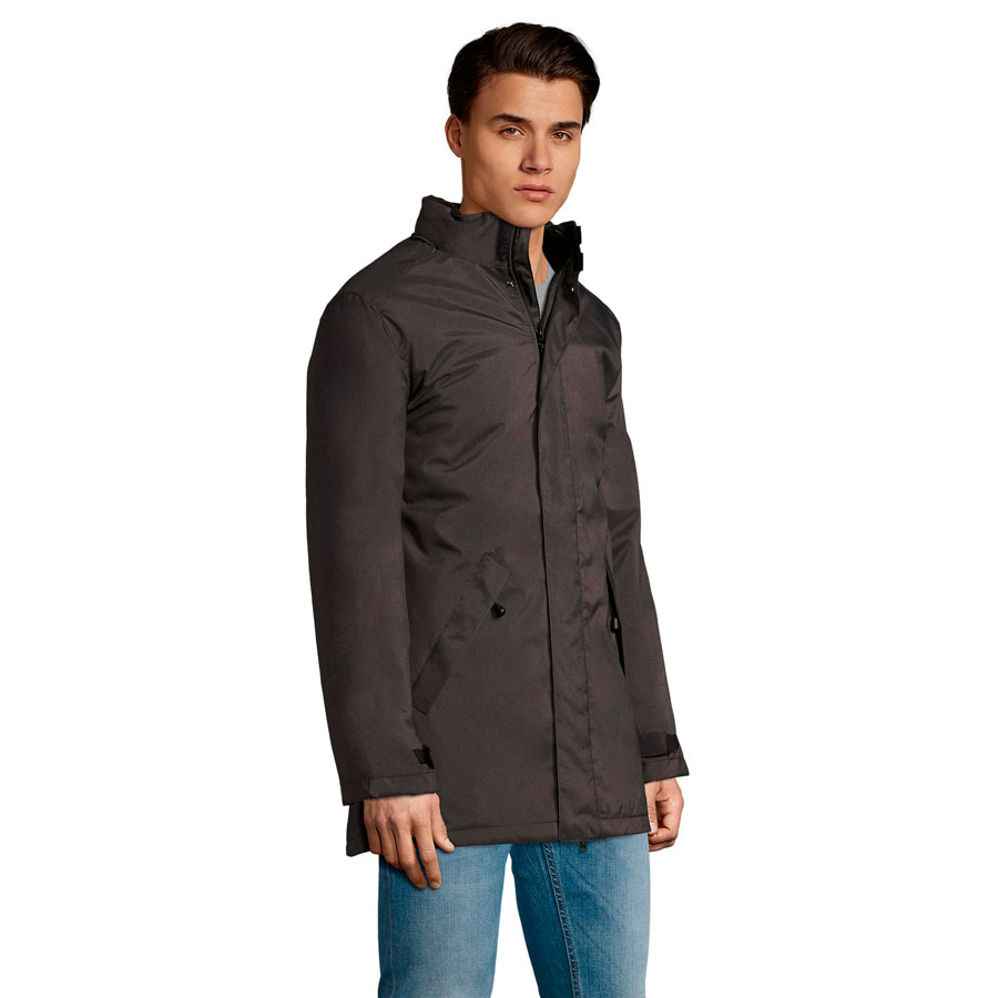 Куртка-парка унисекс на стеганой подкладке ROBYN 170 Основная ткань «оксфорд»: 100% полиэстер с водоотталкивающей пропиткой Стеганая подкладка: 100% полиэстер Утеплитель: 100% полиэстер, 170 г м2 Стильная теплая парка унисекс прямого кроя станет необходимой в промозглое осенне-зимнее время года. Благодаря пропитке ПВХ - (PVC) поливинилхлорид, ткань полностью прорезинена внутри, что делает ее водонепроницаемой и формоустойчивой. Куртка на застежке-молнии с двумя пуллерами для удобства открытия и планкой на скрытых кнопках надежно убережет от попадания ветра и влаги. Внутренняя планка на верхней части куртки обезопасит от прищемления молнией при закрытии. Высокий воротник- стойка (7 см) с внутренней стороны отделан флисом для мягкости и комфорта, а снаружи прячет в себя капюшон на кулиске с резинкой и стопером. Капюшон без утеплителя всегда можно легко достать и разложить, если погода резко испортится, а потом также убрать. Длинные рукава с утеплителем внутри и на застежке-липучке помогут сохранить тепло. 2 внешних кармана на молнии и один внутренний на застежке-липучке уберегут небольшие предметы от намокания. Изнутри на стеганной подкладке внизу имеется технологический карман для удобства персонализации. Упакована куртка в прозрачный фирменный пластиковый пакет Sol's. Цвет близкий к PANTONE Cool gray 11C