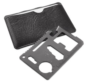Универсальный инструмент в корпусе из нержавеющей стали с 11 функциями. С консервным ножом, ножом, отверткой, линейкой, открывалками для бутылок, гаечными ключами, ключами-бабочками, пилой и транспортиром. Представлен в прочном кожаном футляре.