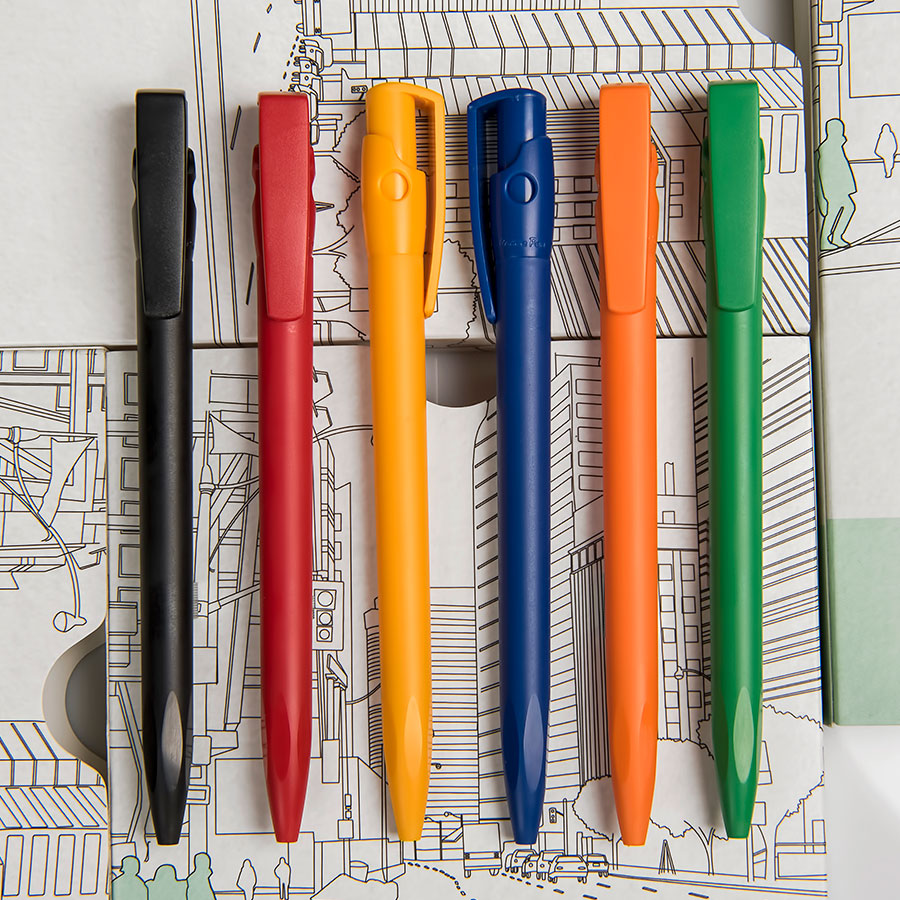 Pantone, близкий к 012C.Европейский стержень X-20, синий.Толщина пишущего узла 1 мм.Немецкие чернила Dokumental.Европейский ABS-пластик.