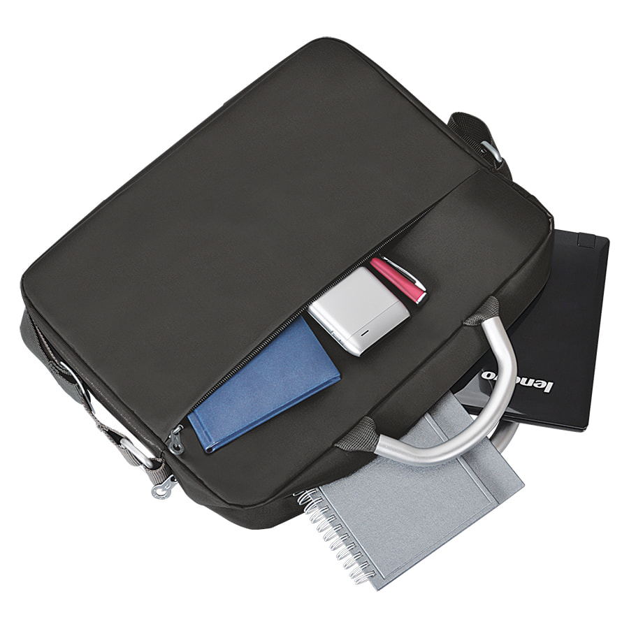 Деловая сумка из микрофибры. Подкладочная ткань - полиестер. Наружный карман на молнии с отделениями для ручек, документов и телефона. Задний карман. Съемный плечевой ремень. Шильд для гравировки 4,9*1,5 см.
