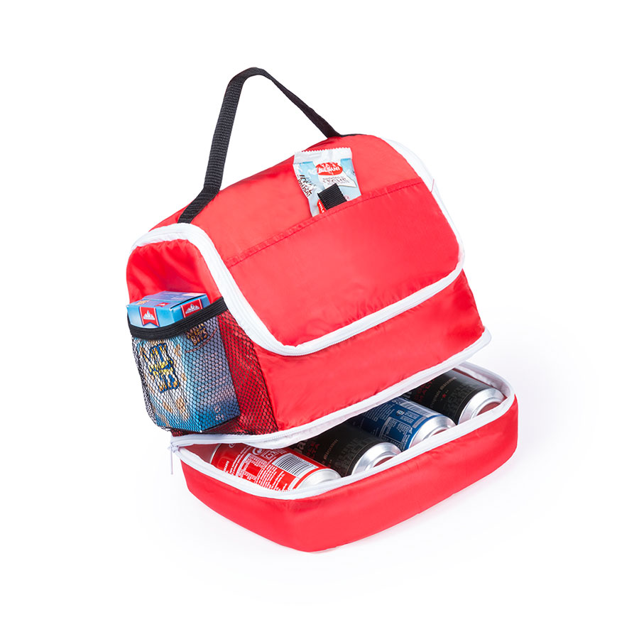 Универсальная сумка-холодильник из полиэстера 210D с двумя независимыми отделениями на молнии. С передним карманом на липучке и боковым карманом из эластичной сетки. Изотермический внутри в отделке PEVA. С практичной ручкой для переноски из прочного нейлона.