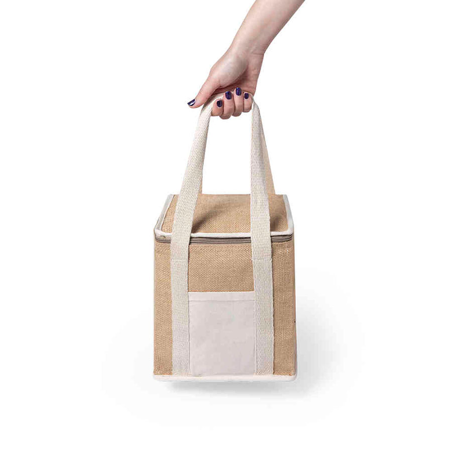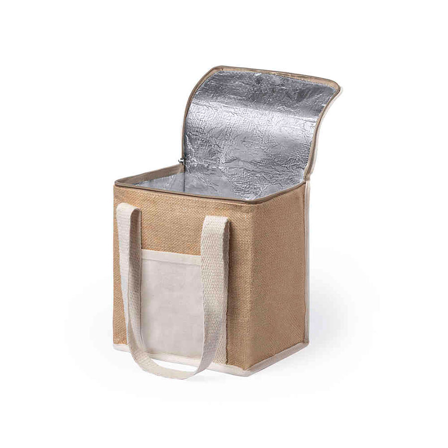 Высокая сумка-холодильник из влагостойкого ламинированного джута, с изотермической внутренней отделкой из алюминия. Хлопковые ручки и внешний карман для печати из хлопка.
