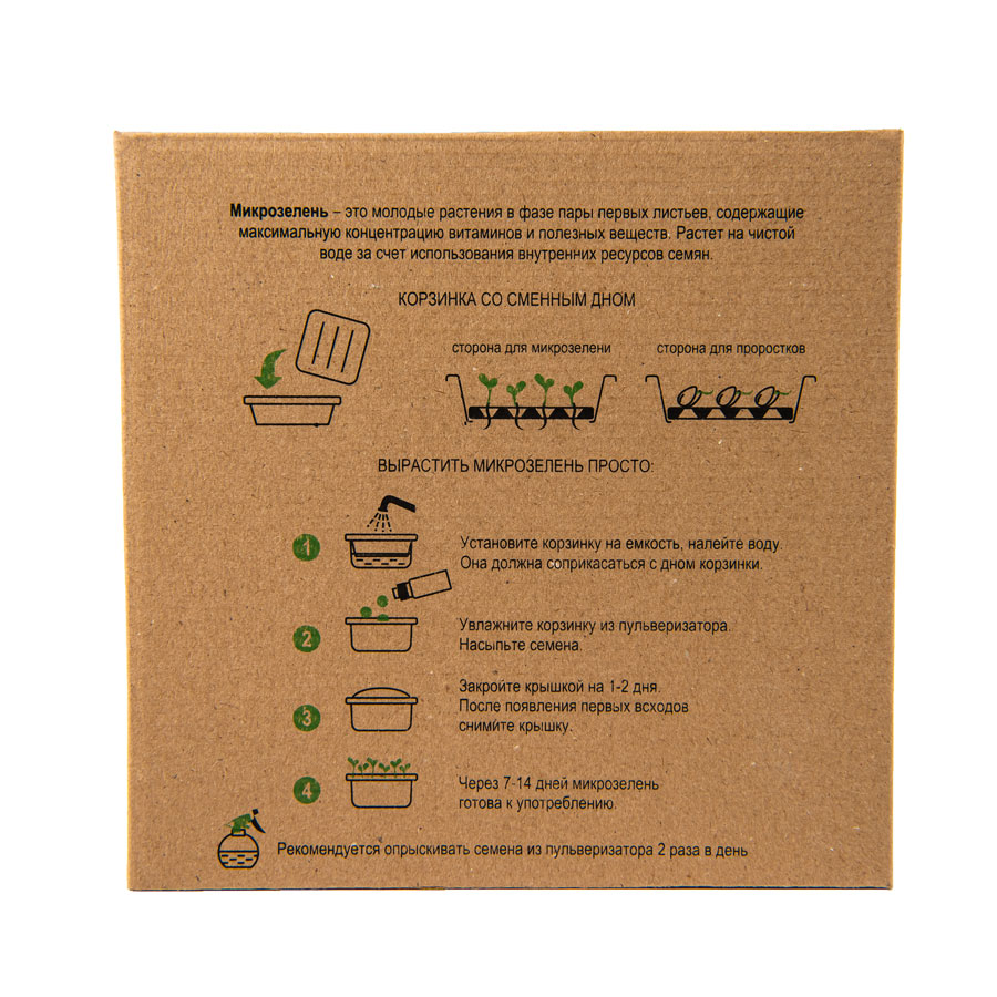 Проращиватель «Моя микрозелень» подходит для выращивания сочной микрозелени и проростков.Микрозелень – молодые всходы растений в фазе первых двух листочков, содержащие максимальную концентрацию витаминов и полезных веществ. Растет на чистой воде за счет использования внутренних ресурсов семян. Комплектация набора: - крышка, - корзинка, - сменное дно, - емкость для жидкости. Проращиватель подходит как для крупных семян, так и для самых мелких. Для выращивания микрозелени установите сменное дно широкими бороздами вверх. Для проростков - широкими бороздами вниз. В рамках заказной программы срок доставки на склад Москвы от 10 дней с момента оплаты заказа. Резерв - 5 дней. Минимальный тираж в рамках заказной программы кратен одной коробке. Детальная информация об остатках товара на удаленном складе предоставляется по запросу.
