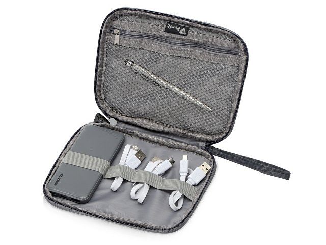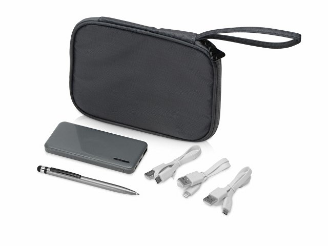 Комплектность: органайзер для проводов 18 х 14 х 2 см, внешний аккумулятор 5000 mAh 5,6 х 12,1 х 1,3 см, ручка-стилус шариковая d0,8 х 12,8 см