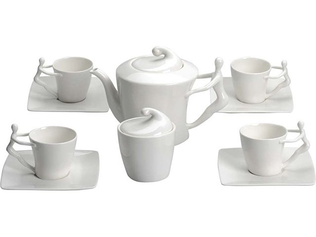 Оригинальный керамический сервиз белоснежного цвета состоит из чашек, блюдец, чайника и сахарницы. Ручки чашек и чайника выполнены в виде стилизованной фигуры человека.