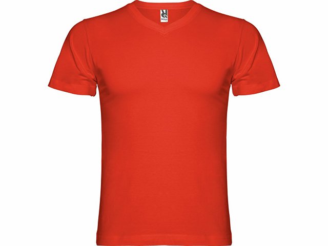 Мужская футболка без боковых швов с коротким рукавом и V-образным вырезом горловины, отделанном рибом 1х1. Горловина и плечевые швы дополнительно укреплены тесьмой.