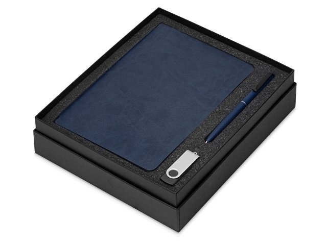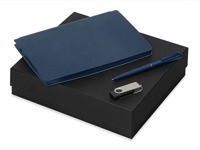 Цвет товара: блокнот- темно-синий, флешка- черный/серебристый, ручка- красный/черный