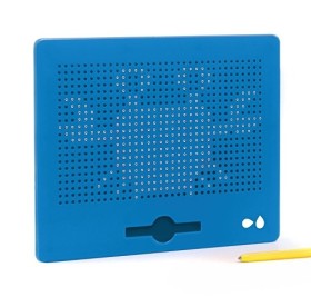 В комплект входит намагниченное перо и доска с ячейками, у которой внутри металлические шарики. И если поднести к одной ячейке перо, то одна из этих бусинок сразу поднимется наверх и займёт место в отверстии. А на планшете как будто будет нарисована точка. Если же провести магнитным пером по доске – получится линия, контур, фигура, цифра, буква и даже полноценная картинка.