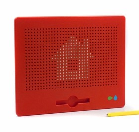 В комплект входит намагниченное перо и доска с ячейками, у которой внутри металлические шарики. И если поднести к одной ячейке перо, то одна из этих бусинок сразу поднимется наверх и займёт место в отверстии. А на планшете как будто будет нарисована точка. Если же провести магнитным пером по доске – получится линия, контур, фигура, цифра, буква и даже полноценная картинка.