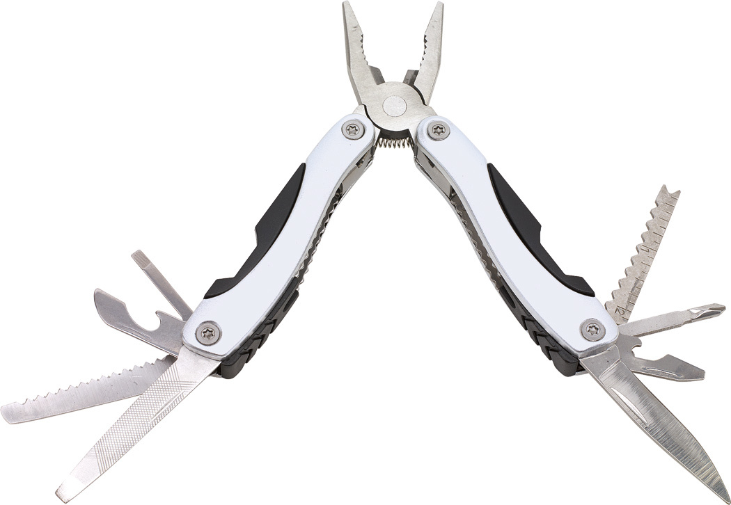 Многофункциональный инструмент BIG PLIERS складные плоскогубцы, ручки покрыты алюминием, из нержавеющей стали; пила, напильник, скребок для рыбы с меркой в дюймах, открывалки для консерв и бутылок, отвертка Philips и плоская двух размеров, нож; в нейлоновой сумке на липучке, со шлейкой для закрепления на ремне