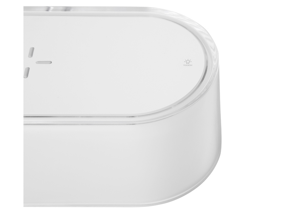 Ночник с RGB-подсветкой из 7 переливающихся цветов. Также есть режимы стандартного и яркого освещения теплым светом. Ночник выполняет функцию зарядной станции для устройств, поддерживающих беспроводную зарядку стандарта Qi мощностью 15 Вт*. Функция ночника работает без подключения к сети благодаря встроенному аккумулятору на 400 мАч. Функция беспроводной зарядки работает только при питании от сети. Устройство можно брендировать методом УФ-печати, тампопечати, а также цифровой печати. *при наличии сетевого адаптера 18 Вт, в комплект не входит. 1. быстрая беспроводная зарядка до 15 Вт. 2. 3 режима работы подсветки. 3. встроенный аккумулятор 400 мАч для работы ночника. 4. удобная форма для нанесений.