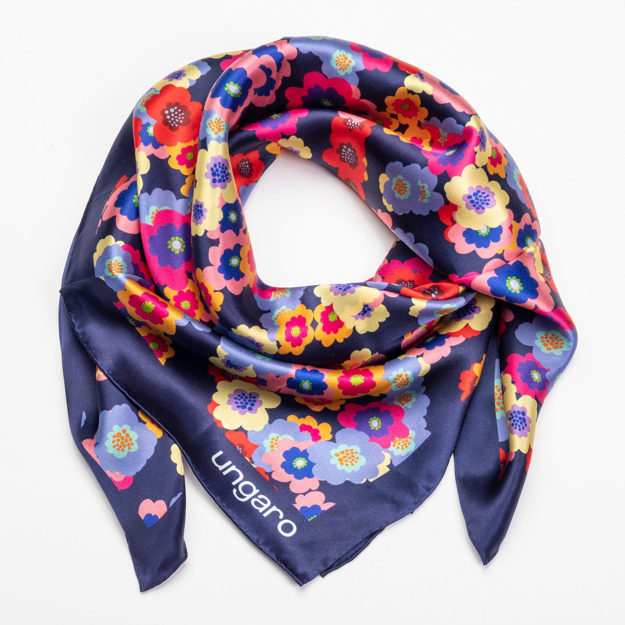 Квадратные шелковые платки «Chiara» изготовлены из шелковых материалов высочайшего качества. Графический цветочный принт женственный.
