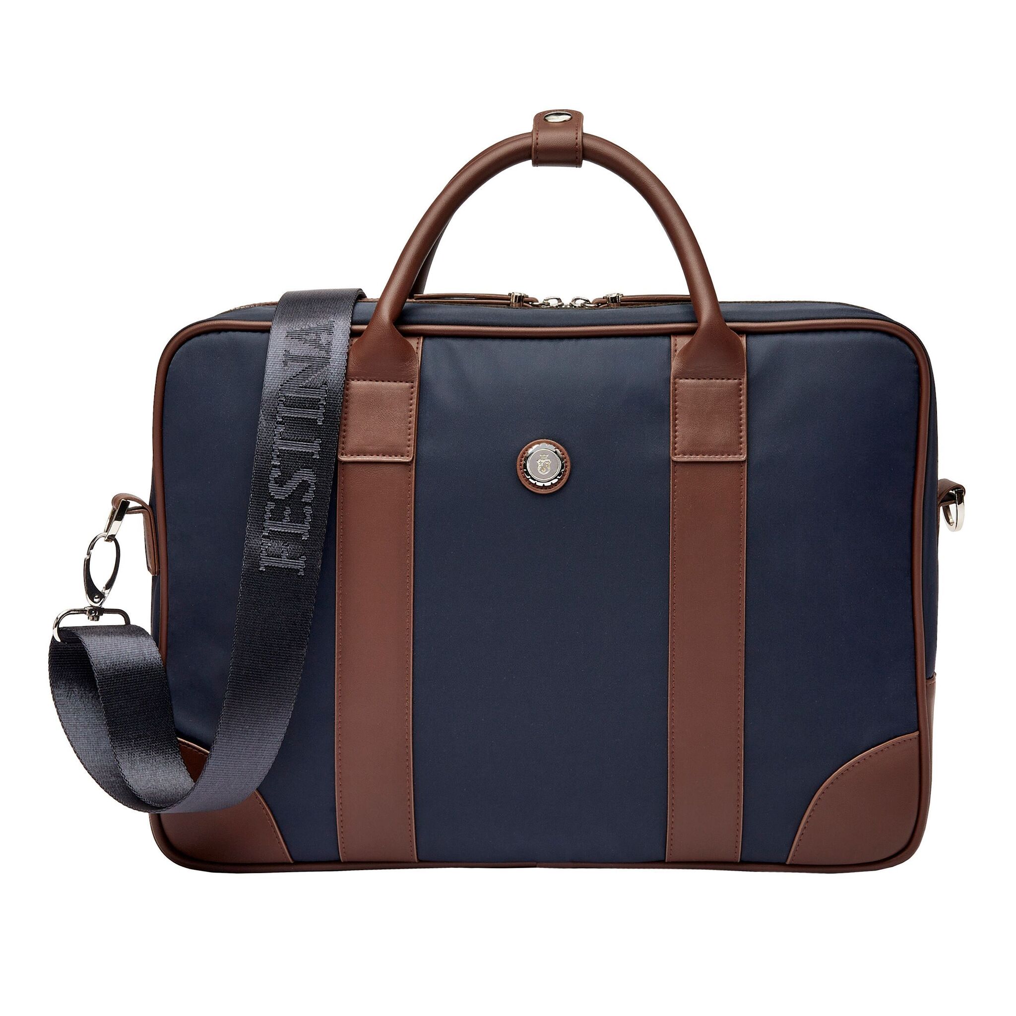Сумка-кнопка "Festina" изготовлена из гладкого нейлона с фактурной отделкой. Большая пластина-блейзер Button заимствована из нашей одноименной небольшой линейки кожаных изделий. Четкие хромированные акценты и роскошные металлические детали придают ей элегантный последний штрих, сохраняя при этом общую непринужденную эстетику. Линия кнопок доступна в двух цветах: одна версия полностью черная с фирменной пластиной, окрашенной эмалью, в то время как другая версия сочетает темно-синий нейлон с коричневой веганской кожей и четкой хромированной отделкой. Обе версии несут в себе непринужденную элегантность и легко смешиваются и сочетаются. Наш фирменный логотип Festina изящно вытиснен на каждом изделии, сдержанный последний штрих. Каждая деталь изящно обработана, включая бегунки молнии, украшенные гербом Festina, а также подкладку с монограммой Festina. Сумки для документов Button легкие и удобные для переноски, но также очень функциональны благодаря отделению на молнии и специальному отделению для ноутбука.