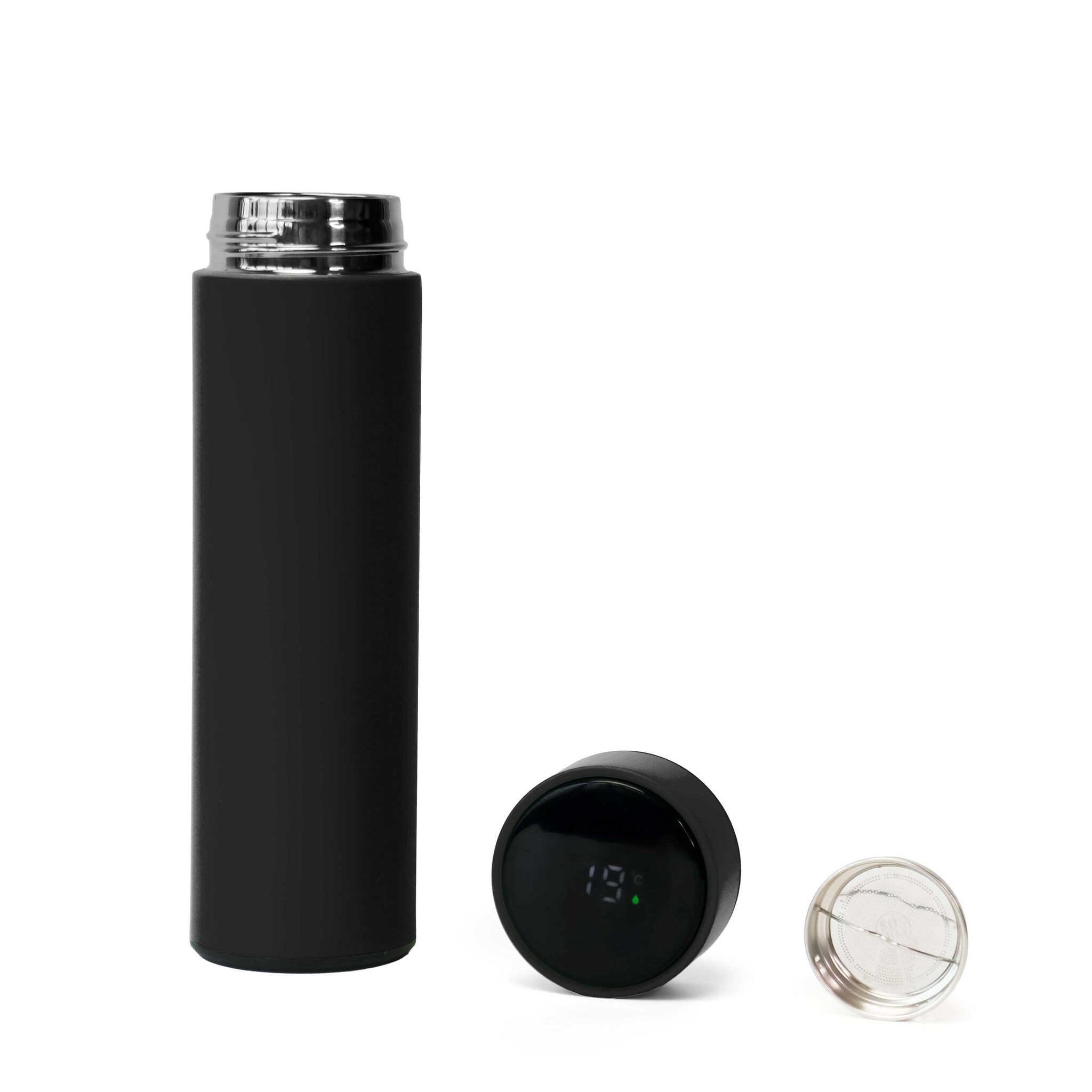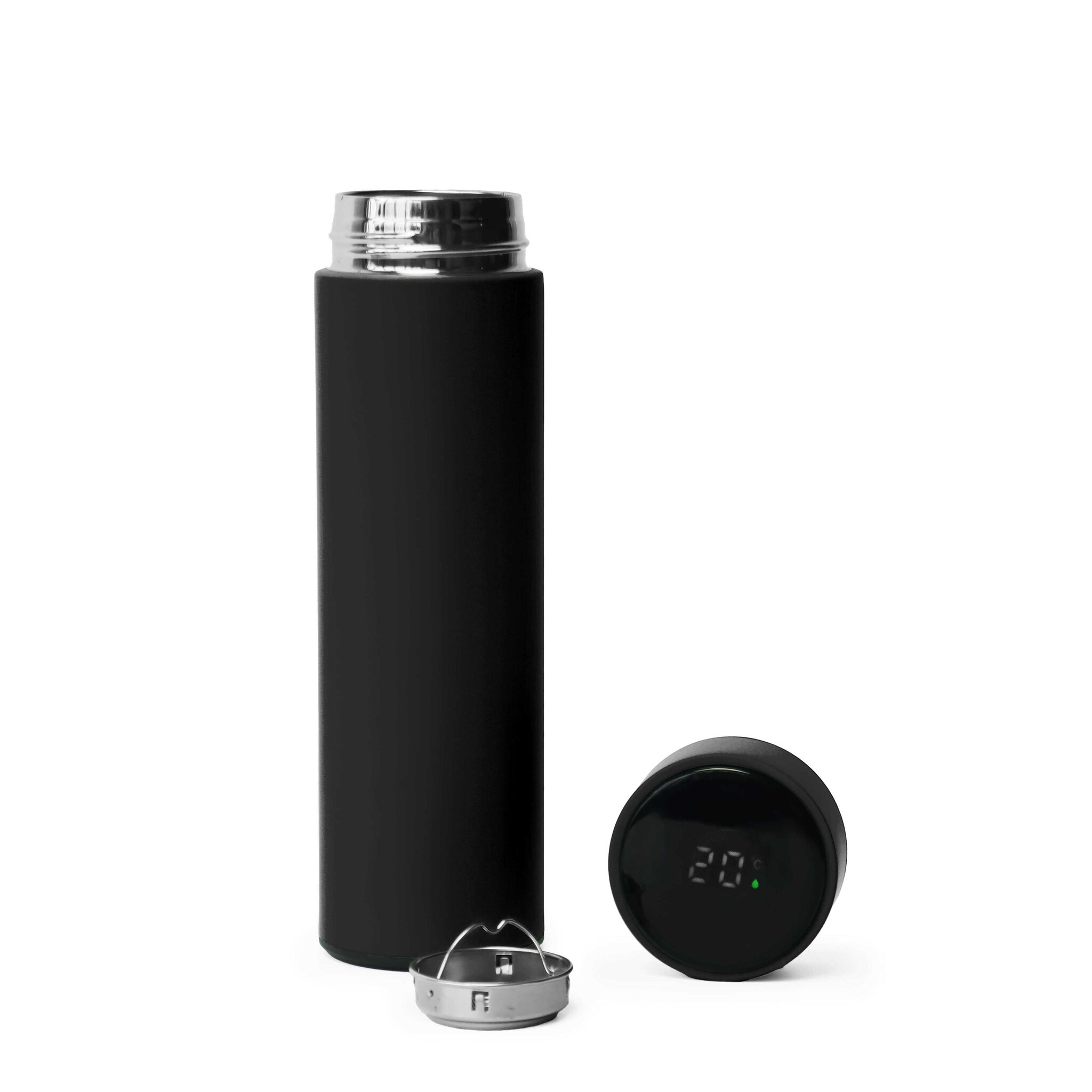 Термос из нержавеющей стали, покрытый цветным soft touch, с крышкой, в которой встроен термометр и LED дисплей, показывающий температуру внутри термоса. Объем: 500 мл. Упаковка: каждый термос в крафт коробке.