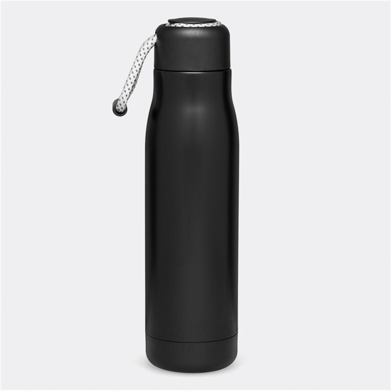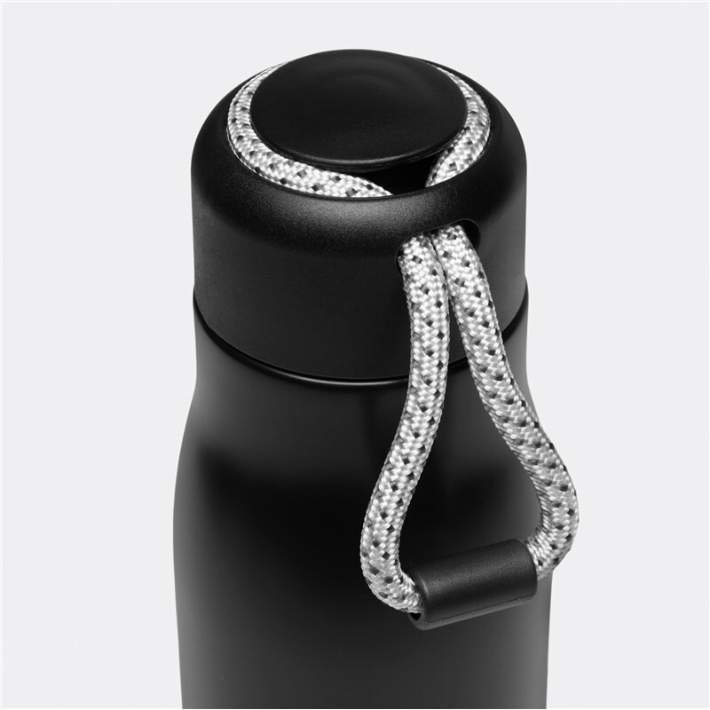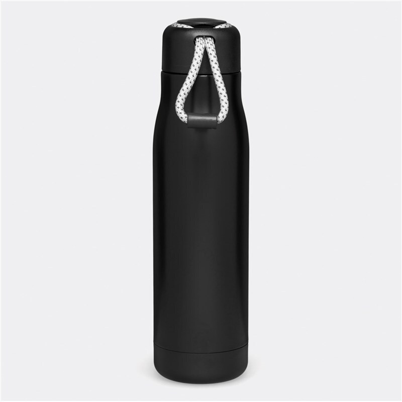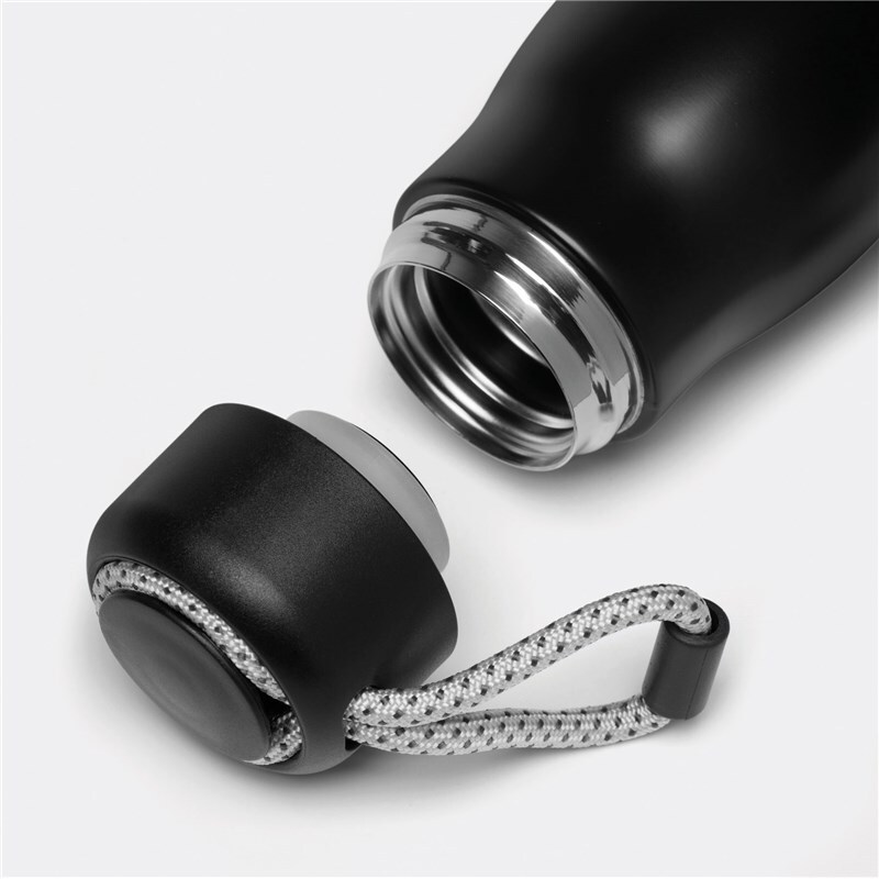 Вакуумная бутылка для питья ROBUSTA, с двойными стенками: внутри и снаружи из нержавеющей стали, завинчивающаяся черная крышка с декоративным ремнем для переноски, емкость: ок. 500 мл, сохраняет тепло ок. 8 часов и холод до 12 часов.