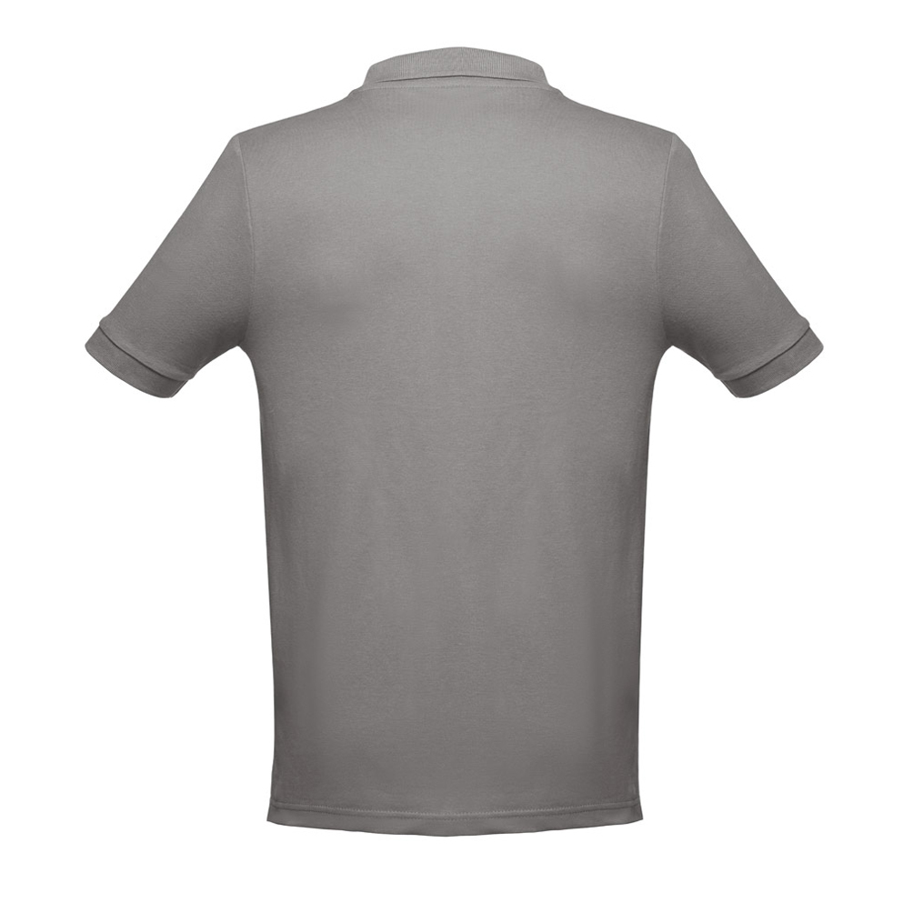 Мужское поло. Трикотаж пике 100% хлопок: 195 г/м². Манжеты и воротник на резинке. Укрепляющая лента на воротнике и планка c 3 пуговицами в тон. Нижняя часть с разрезами. Запасная пуговица на внутреннем шве. Завернутый шов внизу