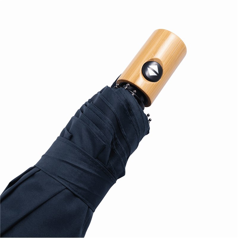 Полностью автоматический ветрозащитный карманный зонт CALYPSO в цветном чехле: металлический стержень из 3 частей, с металлическими-стеклопластиковыми спицами и металлическими наконечниками, бамбуковая ручка с ремешком для руки, купол из полиэстера-понджи из переработанного пластика / RPET, застежка-липучка